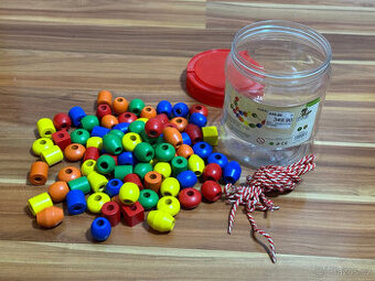 Dřevěné korálky v různých základních barvách a tvarech + šňůrky, obsahuje 88 koráků. Skvělá hračka pro rozvoj dětské jemné motoriky a poznávání barev. Velikost je cca 2 cm - 3 cm. Nevhodné pro děti do 3 let. V dobrém stavu, bez poškození. Preferuji osobní předání na Praze 4 - Modřany, v případě zaslání cena + poštovné.