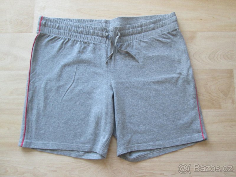 Prodám šedé kraťasy, po straně mají růžový prožek, vel.cca 42, boční délka cca 42 cm, pas v klidu cca 92 cm, v pase je guma a šňůrka, materiál bavlna, jsou velmi zachovalé, málo nošené.