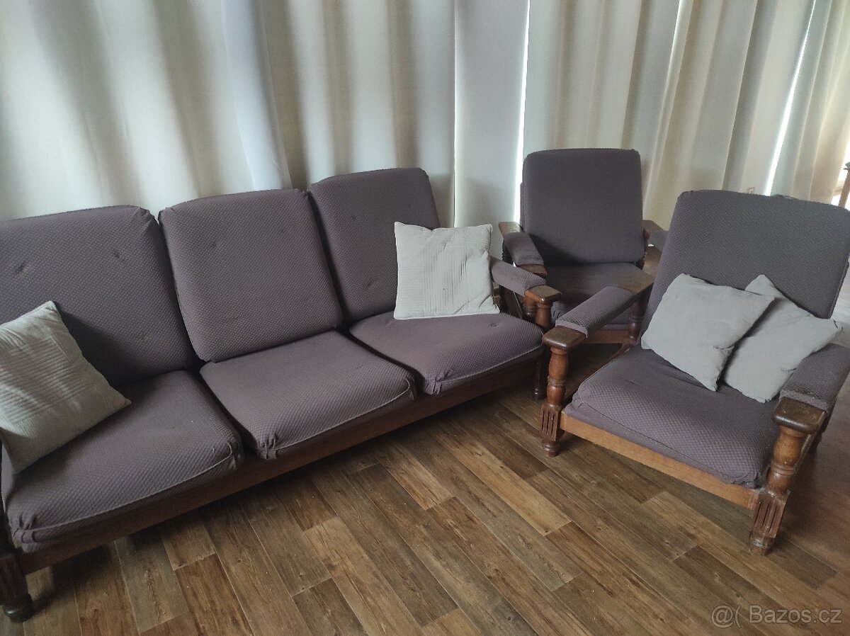 Sedací soupravaProdám sedací soupravu (sedačka a 2 křesla). Kvalitní dřevěná konstrukce. Použitá, ale stále pěkná a funkční. Cena 1000kc