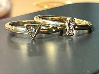 Prodám sadu dvou prstenů ve zlatém provedení s geometrickými tvary a kamínky. ve zlatém provedení s decentními kamínky (zirkony). Prsteny mají moderní geometrický design – jeden s trojúhelníkovým a druhý s obdélníkovým zdobením.