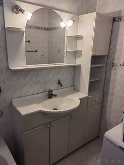 Prodám zachovalý koupelnový komplet. Rozměry: umyvadlo: šířka 91 cm, hl. 30, hl.v oblouku umyvadla 40 cm, výška 83 cm. Zrcadlová galerka šířka: 91 cm, výška 63 cm. Skříň, výška 183 cm, šířka 35cm, hl. 30 cm. Cena za celý komplet, včetně světel a baterie.
