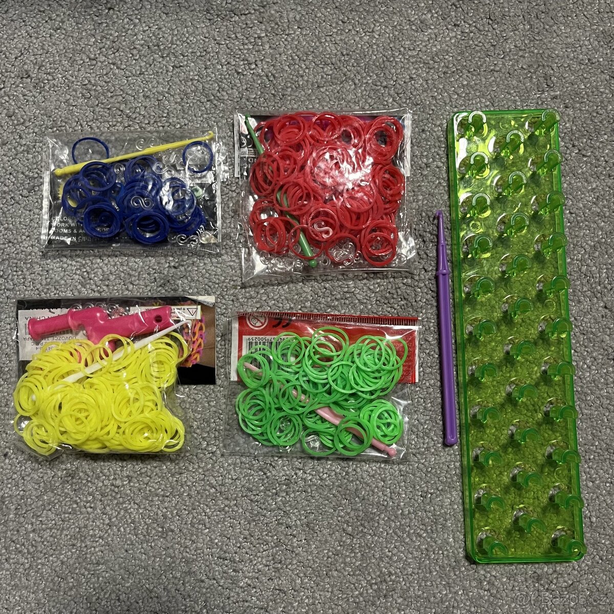 4 balíčky barev - žlutá, modrá, zelená, červená. Esíčka a malý háček ke každému sáčku gumiček. Velký nástavec a velký háček. Zasílám po platbě předem na účet. Lze zaslat zásilkovnou/balíkovnou/poštou. Možné osobní předání: Brno, Mikulčice, Hodonín, Břeclav, okolní vesnice.