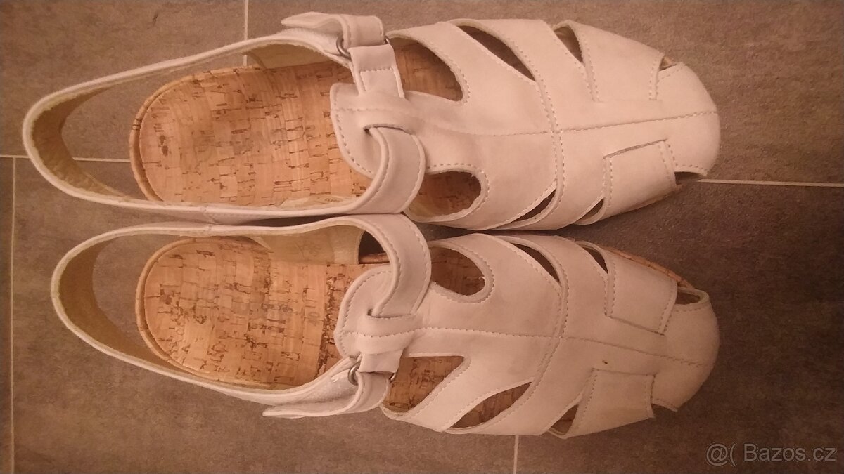 Prodám kožené sandály č. 40 značky Suave. Boty jsou velmi kvalitní a pohodlné, kožené zvenku i zevnitř, mají korkovou stélku. Jsou lehoučké. Klínek 4 cm, zapínání na suchý zip.