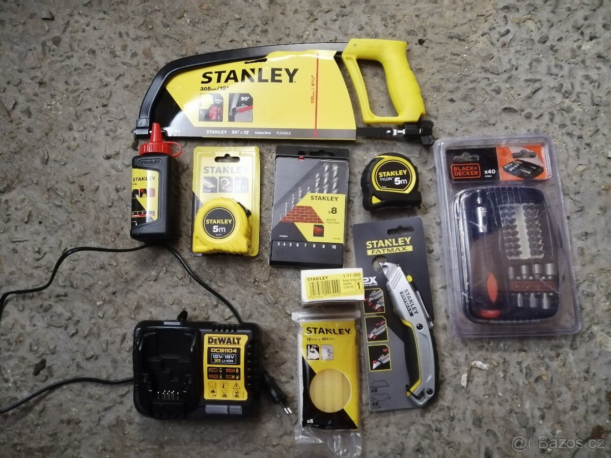 Cena: V textu. Nabízím žluté doplňky, od něčeho mám více kusů Metr 5m-50kc Metr tylon 5m-100kc Pila 100kc Sada vrtaku 100kc Práškováci krida(5 kusů) - 100kc Nůž fatmax 150kc Plátky 9mm 1-11-300 (10 sad po 10 kusech) - 200kc Silné lepící tycinky-50kc Black decker sada bitů 40ks-150kc Dewalt DCB1104-400kc Dewalt klic-200kc
