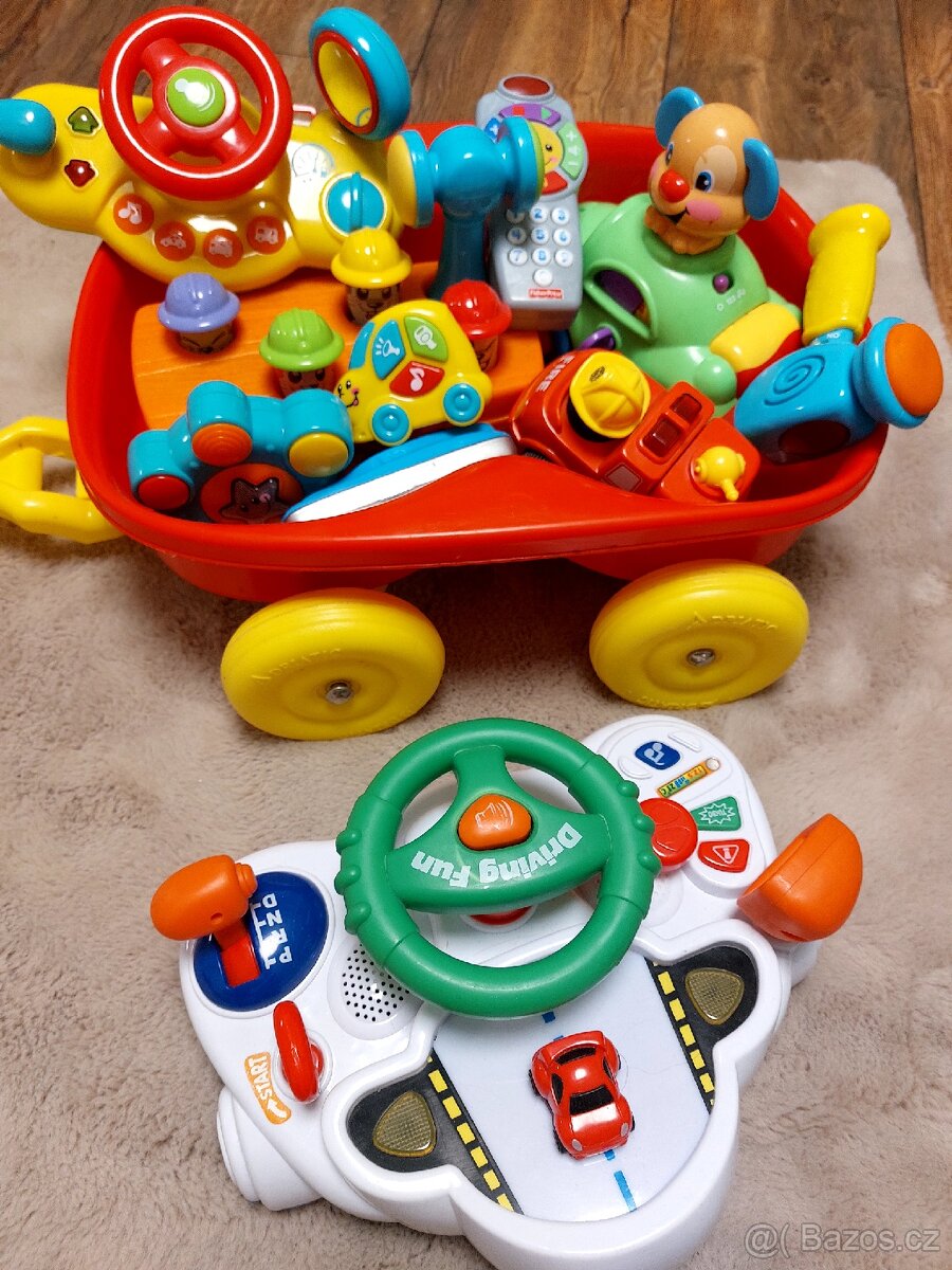 11 ks hraček na baterie + plasový vozíček. Všechny hračky kromě vozíčku vydávají zvukové nebo světelné efekty. Mix značek. Všechny hračky jsou plně funkční, jen na volantu netroubí klakson a autíčko na "haupně " málo zatáčí do prava. Pošlu GLS na adresu nebo do výdejního místa za 60 nebo jakýmkoliv dopravcem dle platného ceníku.