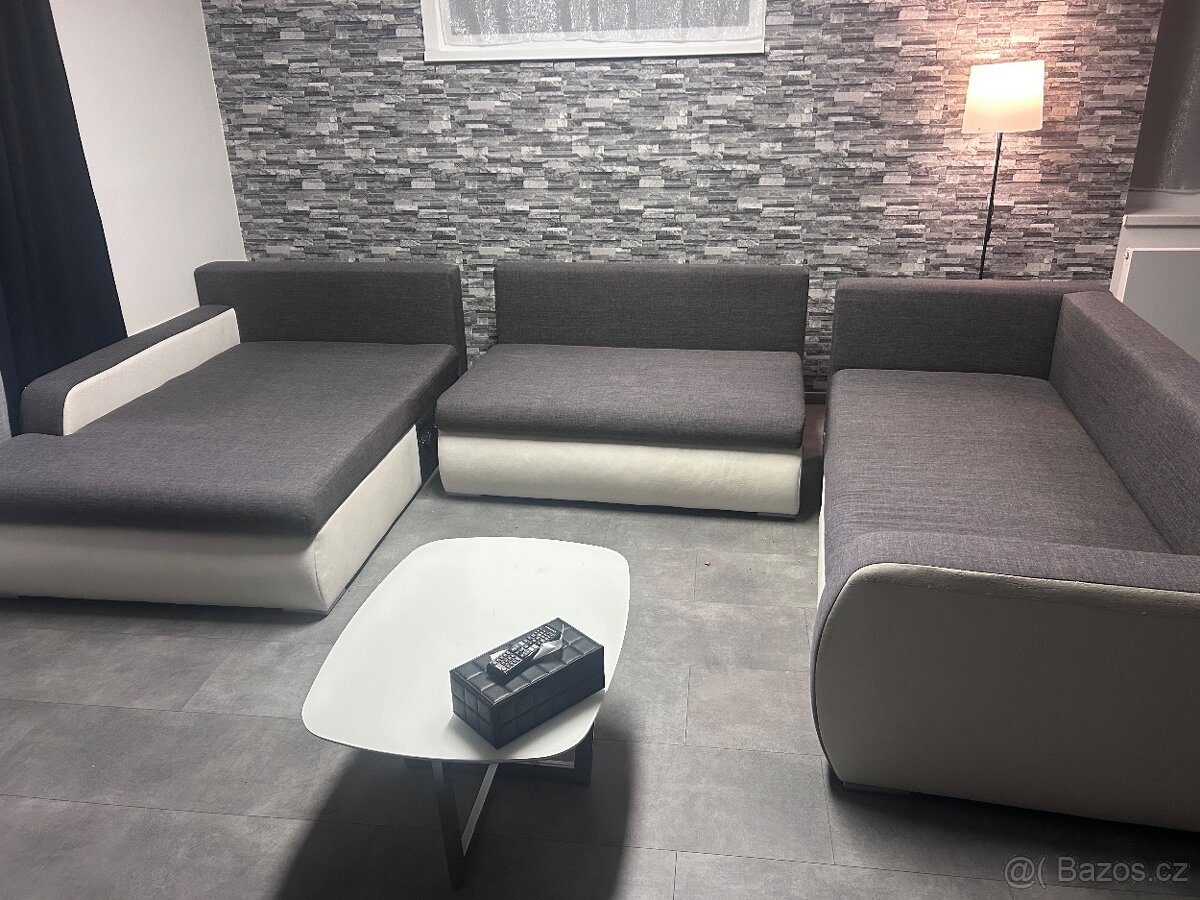 Sedací souprava, rozkládací, s úložným prostorem, složená ze třech dílů. Rozměry: - 3,4 metru šířka - 1,75 metru délka delší strany Stav - viz. fotografie. Jedna část má prasklou část roštu, tedy se trochu při sezení propadá.