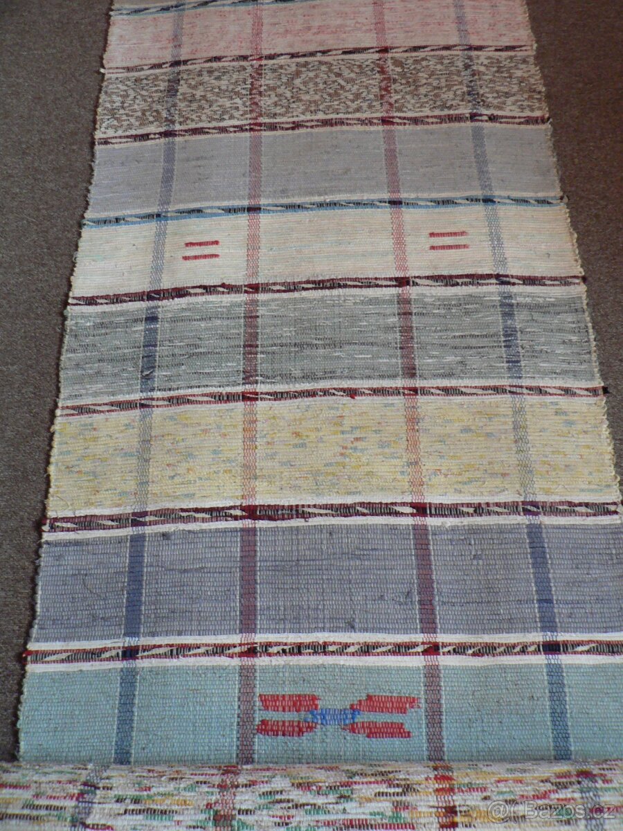 Nabízím ručně tkaný,nepoužitý retro koberec-běhoun.Rozměry š.68cm,délka 10,50 metru.Cena 2000,-Kč,osobní převzetí v Jablonném n.Orlicí nebo v Pardubicích,mohu i poslat.