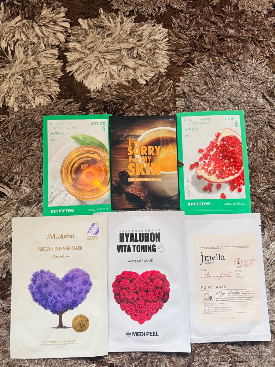 Sada 6 pleťových masek korejské kosmetiky (Innisfree, JMsolution, Medi-Peel, Jmella, I’m Sorry For My Skin). Vše nové, neotevřené. Hydratační, zpevňující a rozjasňující účinky.