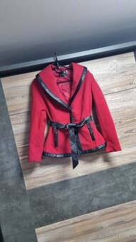 Nový nenošený. Flaušový materiál,koženkové detaily,zapínání na patentek,kapsy. Barva tm.červená. Délka65cm,pruramky 49cm,rukáv odkrku 71cm.