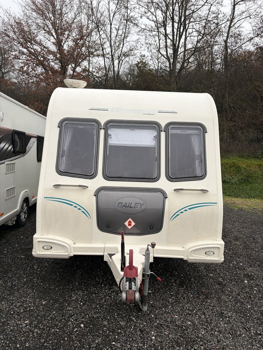 Obytný přívěs Bailey Olympus 464 – model 2011 Velmi praktický karavan vhodný například jako první karavan pro začátek s karavaningem. Karavan je ve výborném stavu. Nabízí pohodlné spaní pro 4 osoby, promyšlené uspořádání a spolehlivou techniku. Základní technické údaje Rok výroby: 2011 Počet lůžek: 4 Celková délka: 6 350 mm Celková šířka: 2 190 mm Nejvyšší technicky přípustná hmotnost: 1 320 kg Dispozice a interiér Přední rozkládací sezení přeměnitelné na dvoulůžko Zadní část s dvoulůžkem Praktický odkládací stolek Koupelna umístěná v zadní části Sprchový kout Chemická toaleta Samostatné umyvadlo Kuchyně Absorpční chladnička Plynové sporáky Elektrická plotýnka Mikrovlnná trouba Plynová trouba Gril Dřez s odkapávačem Pracovní plocha Topení a technické zázemí Topení Truma (plyn / 230 V) Ohřev vody Truma (plyn / 230 V) Rozfuk teplého vzduchu Ovládací panel Vestavěné rádio Komfort a doplňky Movery pro snadné manévrování Sítě proti hmyzu na všech oknech Termorole