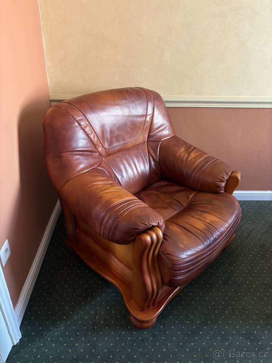 Prodám krásný set rustikální sedačky a dvou křesel z pravé kůže v elegantní hnědé barvě. Masivní dřevěné prvky, bytelná konstrukce, kvalitní zpracování. V perfektním stavu. Cena za komplet: 29 000 Kč