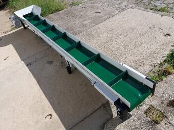 Pásový dopravník - 3 metry dlouhý, pás 25 centimetrů široký. Možno vyrobit dle konkrétního požadavku jiný, nebo upravit hřídel pro řemenici, či osadit elektromotorem (400 V i 230 V) s převodovkou, nebo hydromotorem, příp. variátorem, nebo frekvenčním měničem pro ovládání otáček. Výškově stavitelný, s násypkou, případně s postranními vlnovci. Odlehčená konstrukce pro lepší manipulaci. Vhodný pro přepravu uhlí, dřevěných špalíků, pelet, brambor, ovoce, suti, písku, štěrku, štěpky, pilin a sypkého materiálu. Možnost zaslání přepravní společností. Cena je uvedena bez pohonu z důvodu využití vícero možností zapojení.