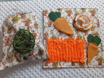 set pro králíčka nebo morčátko,kobereček na pamlsky,které se do něj schovají a králíček hledá... 30cm,seník 20cm na uvázání na klec