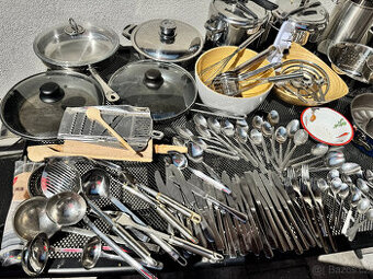 Kuchyňské nádobí a náčiní na indukční i jiné varné desky, pěkné, plně funkční, vše odpovídá fotografiím. Jen vysoký hrnec na chřest není určen pro indukci. 2x tlakový hrnec nerez, pánve, formy na pečení, smalt pekáč s víkem, příbory a kuchyňské náčiní, mísy, velmi pěkný stav. Vhodné do provozu i do domácnosti. Cena za vše, ne jednotlivě. Zaslání lze domluvit. Viz 20 fotek. Prodávám i jiné nádobí v jiném inzerátu.