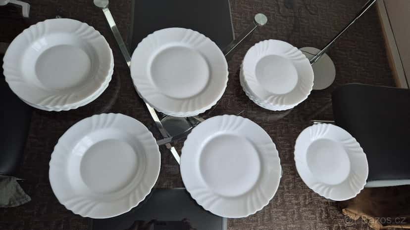 Prodám sadu bílých talířů Luna s vlnkami. Hluboký talíř 23 cm 6x Mělký talíř 25,5 cm 6x Dezertní talířky 20 cm 10 x Celkem 22 ks za 300,- Zásilkovnou za 89,- plus 15,- balné (bublinková folie + krabice) Nebo předání Praha 3.
