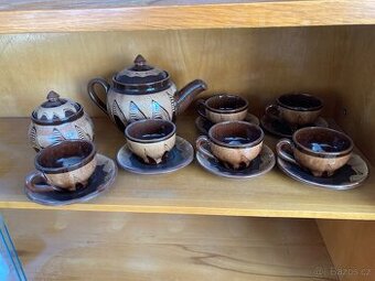 Jedná se o keramický čajový nebo kávový servis s hnědou glazurou a vlnitým dekorem. Sada obsahuje konvici s víčkem, cukřenku s víčkem a šest šálků s podšálky. Nádobí je vyrobeno z keramiky a má výrazný, rustikální vzhled