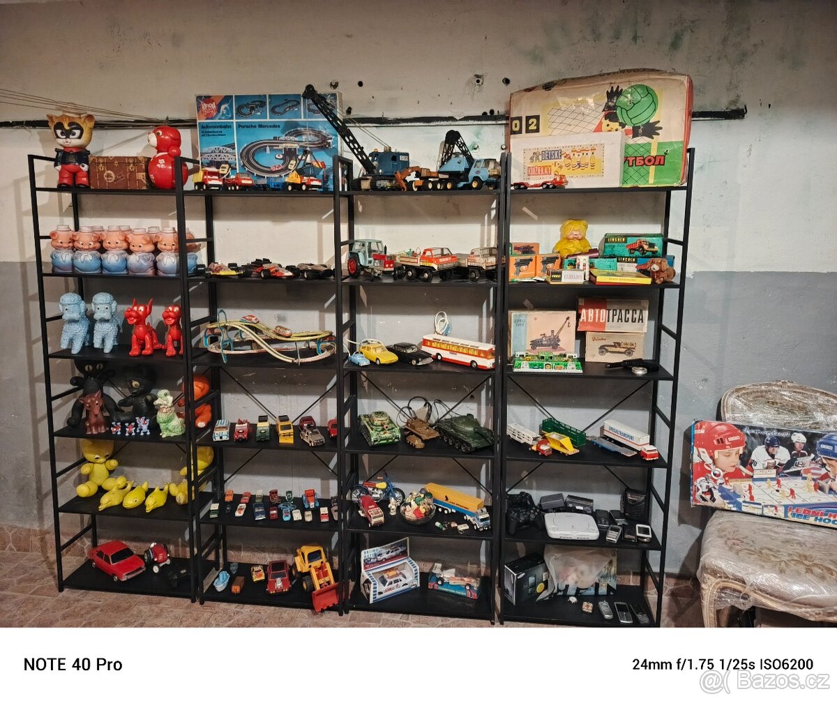 Cena: Dohodou. Retro sbírka hraček – autíčka, modely, plechové hračky, vláčky, krabice Prodám větší sbírku retro hraček z 70.–90. let. Jedná se o různé modely aut, nákladní auta, stavební techniku, plechové hračky, staré krabice (např. Autodráha, Autotrasa), retro herní konzoli, vláček/tramvaj, figurky, plyšové i plastové hračky a další sběratelské kousky. Vše viz foto. Stav převážně dobrý, některé věci hrané, jiné velmi zachovalé včetně původních krabic. Ideální pro sběratele nebo jako dekorace do retro interiéru.