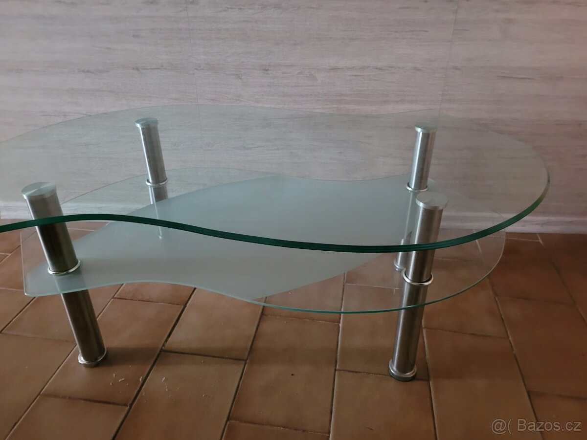 Prodám skleněný stolek .Délka měří 116cm,výška 44cm a šířka 67cm.Nohy jsou kovové a tloušťka skla je 1cm.