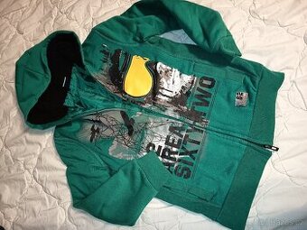 Teplá mikina . Tělo prošité,kapuca chlupatá . Barva zelená ,potisk a zip