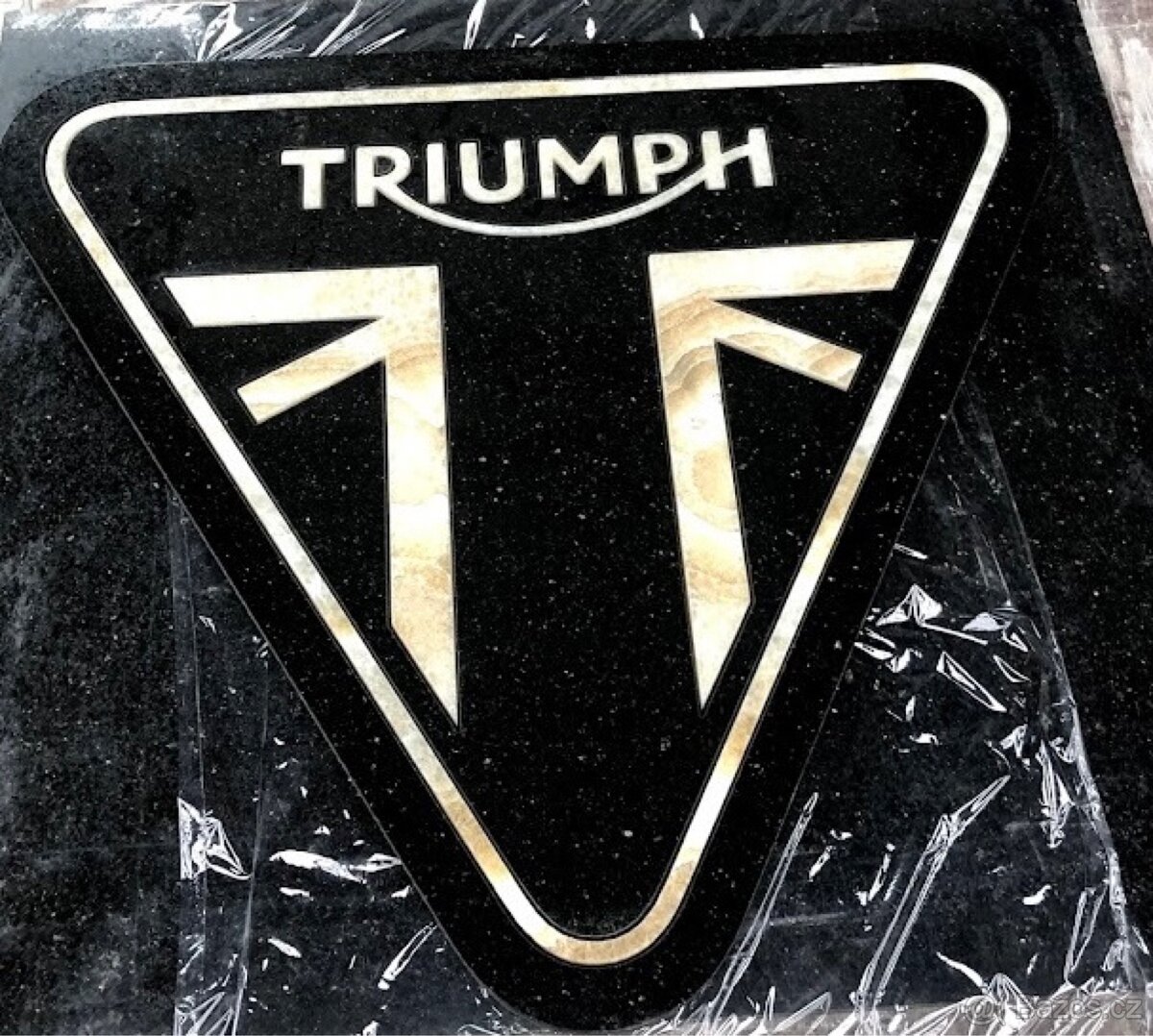 Logo triumph velký dá se použít jako stolek a nebo pověsit na zeď použité materiály žula a onyx logo má každou stranu dlouhou 60 cm váha 15 kg vyrobeno na zakázku
