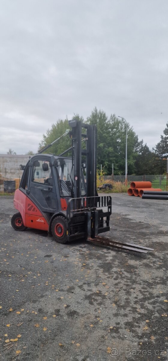 Plně funkční čelní vysokozdvižný vozík LINDE H30D-02 r.v. 2012, nosnost 3 tuny, 4 562mth, duplex, plohovač vidlí KAUP, stavební výška 2,2 m, zdvih 4,6 m, volný zdvih 1,4 m, vidle 1,2 m, topení, superelastické pneu. Pravidelně servisovaný. Platna TK do 11/08 26.