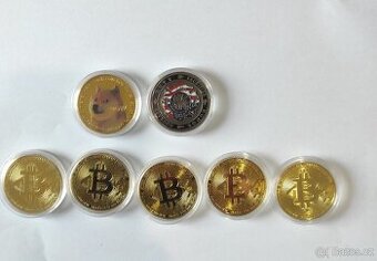 7 mincí v kapslích, pěkný stav viz, foto 5x Bit coin 1x Doge coin 1x medaile- hasiči všechny mají rozměry: 40.0 mm x 3.0mm kontakt emailem balíkovna