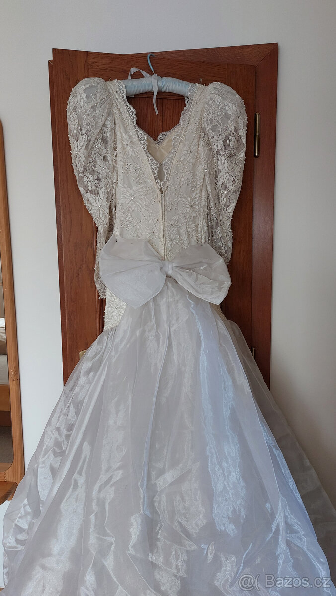 Materiál sukně: tyl, model mořská panna, vlečka. Vel. 36-38 (výška 160-170cm), dlouhý rukáv. Šité na míru v Itálii, ručně vyšívaná krajka, kamínky, perličky, flitry. Šaty jsou vyčištěné.