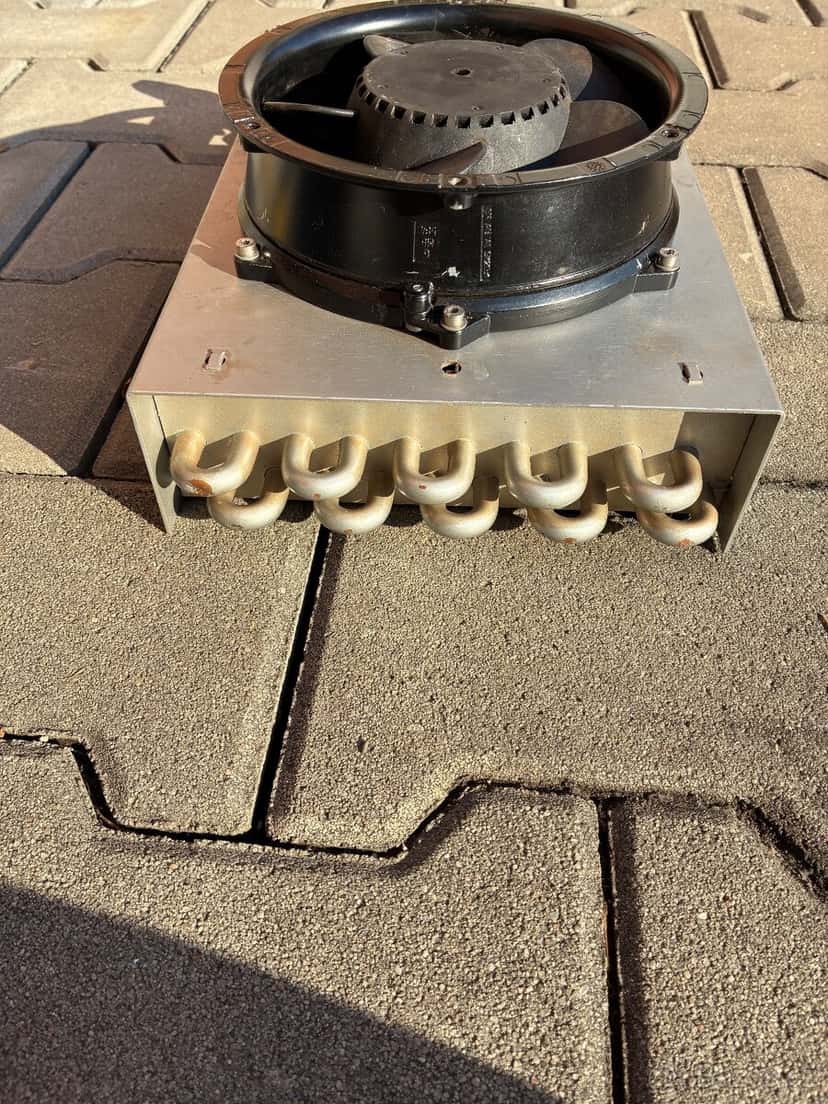 měděný Chladič, radiátor, výměník. S ventilátorem na 24V. Cena za vše tak jak je na fotce.