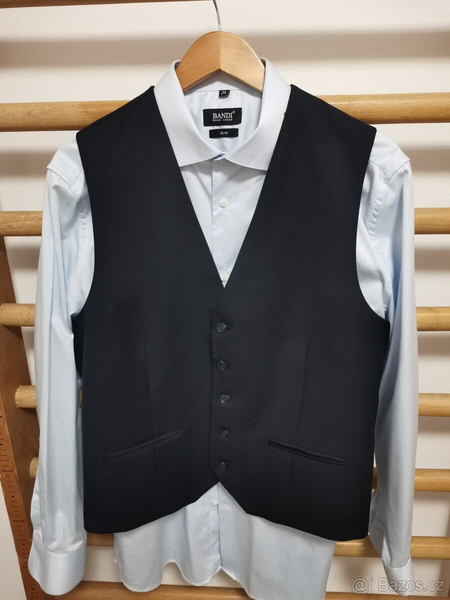 Prodám krásný značkový oblek Bandi včetně vesty a košile. Postava 170-175cm,pas 90 cm. Oblečený pouze 3x