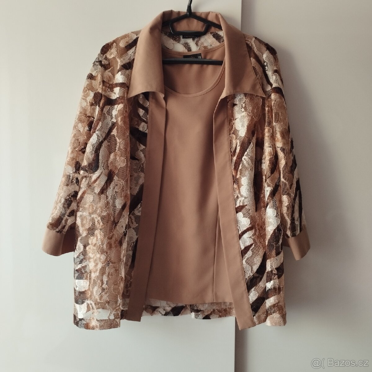 Béžový top s krajkovým bolerkem, 3/4 rukávy, jako nový, vel.XXL,top má rozměr přes prsa 116cm