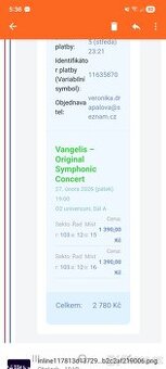 Prodám dvě vstupenky na koncert skupiny Vangelis v Praze O2aréně. Patek 27.2. Cena za jednu byla 1390Kc. Cena za obě 2200Kc.