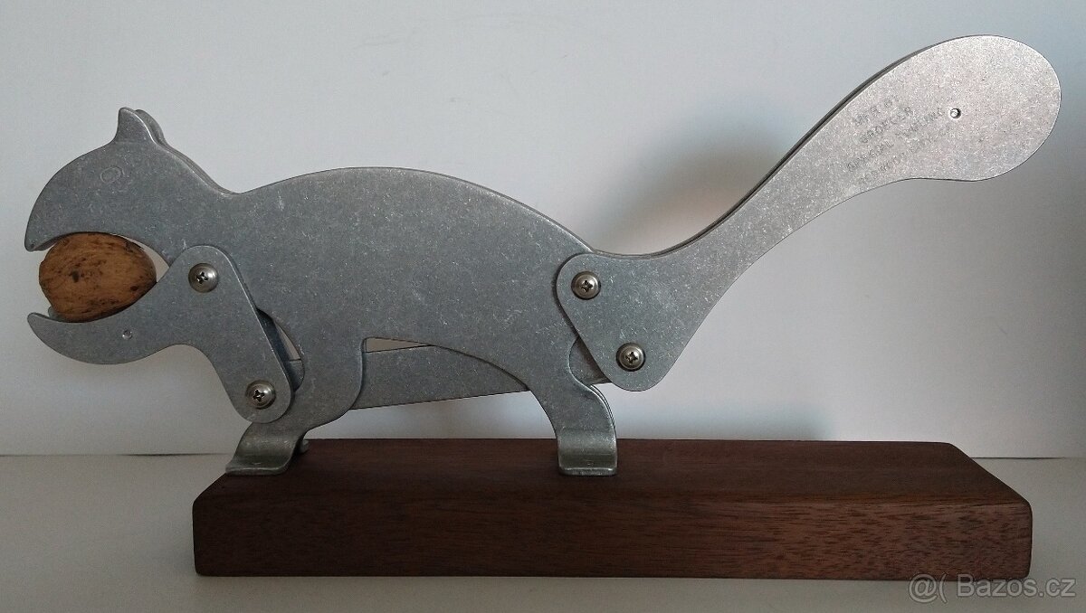 Prodám funkční louskáček ořechů. Základní deska z tvrdého dřeva rozměru 253x67x25 mm, louskáček z hliníku s povrchovou patinou rozměru 345x16x120 mm. Celková hmotnost 0,92 kg. Vhodný pro sběratele, pro přímé použití, popř. jako dekorace. Vyrobeno v Groeger Special Tooling Inc, Redwood City, Kalifornie. Cena 700 Kč