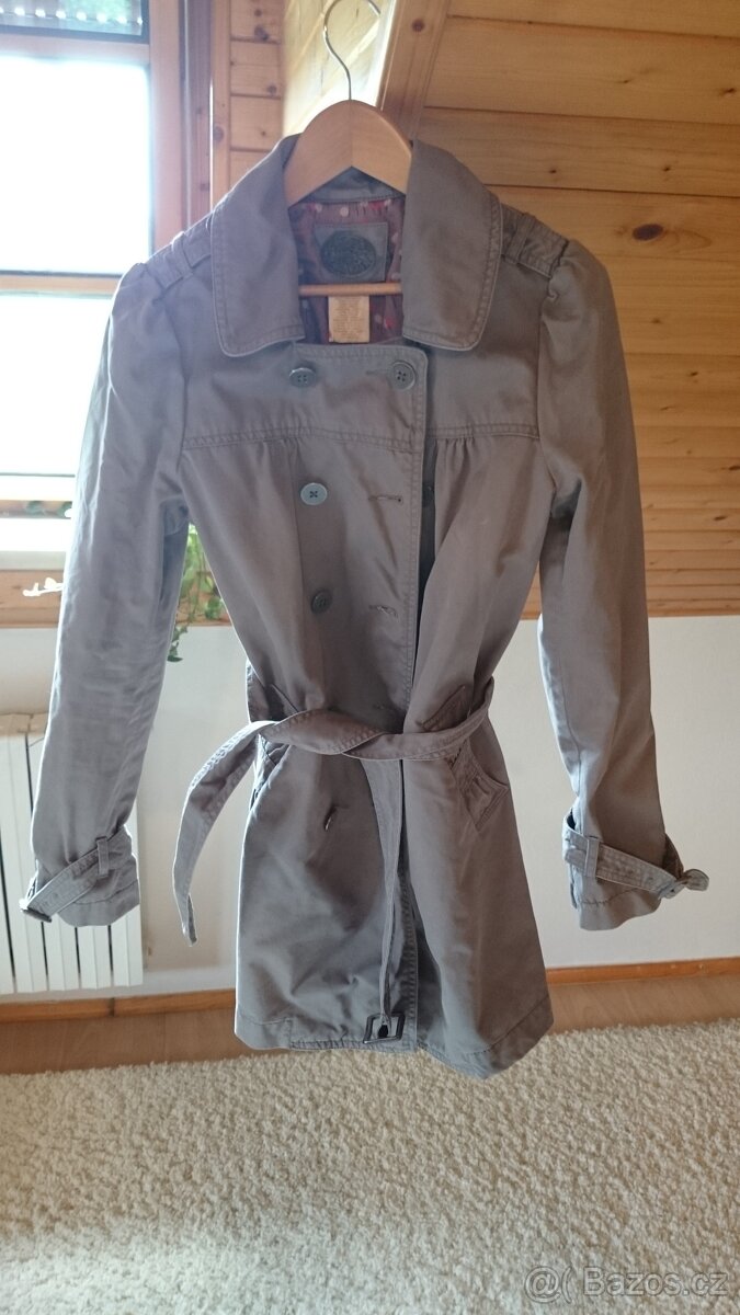 Prodam dámský kabát vhodný od jara do podzimu. Je z bavlny a v odstínu hnědé. Má límec. Dvě řady knoflíků, díky čemuž je možné zapínání kabátu na dvě strany. Má dvě postranní kapsy. V pase nastavitelné stahování pomocí opasku. Velikost 34-36.