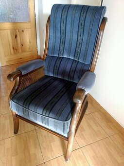 LUXUSNÍ, Rustikální křeslo čalouněné . TOP STAV .Prodám rustikální , dubové křeslo s plyšovým potahem . Záda a boky - ratanový výplet. Pohodlné - vysoké . TOP STAV !