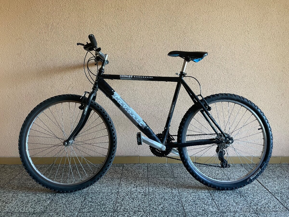 Po velkém servisu – nové lanka + bovdeny, přehazovačka Shimano 3×7 seřízená, V-brzdy s novými lanky, nový zadní plášť, přední 50 %, nové gripy, sedlo v pěkném stavu. Kolo je tiché, plně funkční, bez dalších investic.