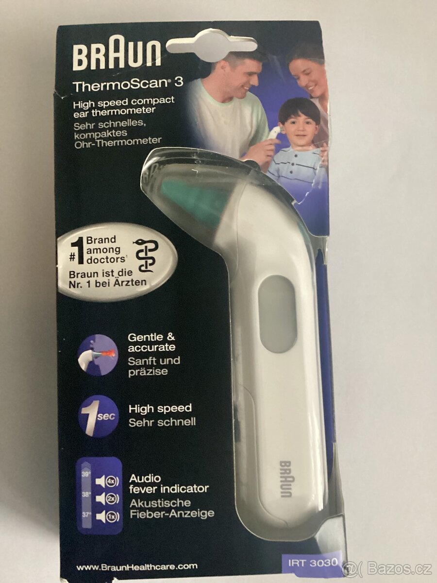 Teploměr Braun IRT 3O30 digitální infračervený teploměr • měření teploty v uchu • dětský zámek baterie • nedráždivý materiál • zvukový poradce teploty • paměť poslední hodnoty • měření již za jednu sekundu Nový pouze rozbalení