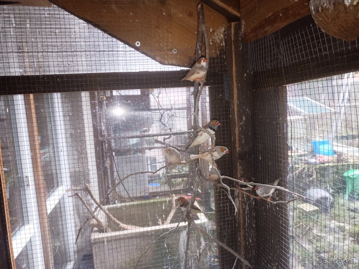 Různé barvy od 15 párů. Celoročně venku. Zebřičky 90kus. Nabízím i mladá morčata chovaná taktéž venku ve voliérách pod ptáky za 300 kus.