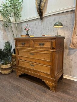 Šířka 91 cm, hloubka 42,5 cm, výška 85 cm. Robustní a velmi reprezentativní starožitná komoda z masivního dřeva, osazená původní kamennou deskou ve světle šedém tónu. Kombinace teplé patiny dřeva a chladné kamenné desky působí mimořádně elegantně a nadčasově. Osobní odběr a doprava: Preferujeme osobní vyzvednutí. Nabízíme rozvoz po celé ČR i do zahraničí 12 Kč/km (počítá se celá trasa, tam i zpět). Při zájmu více zákazníků v jednom směru je možné využít sdílenou dopravu. Je možné se domluvit také na zaslání přes TOPTRANS nebo Českou poštu, ale upozorňujeme, že doručení může trvat i 14 dní. Podmínky prodeje: Jedná se o starožitné/použité zboží, které může nést známky opotřebení. Stav odpovídá fotografiím. Osobní prohlídka možná po domluvě. Vrácení není možné, nabízíme však výměnu za jiný kus stejné nebo vyšší hodnoty (s případným doplatkem). Doklad o koupi na vyžádání (vše evidujeme pro DP).