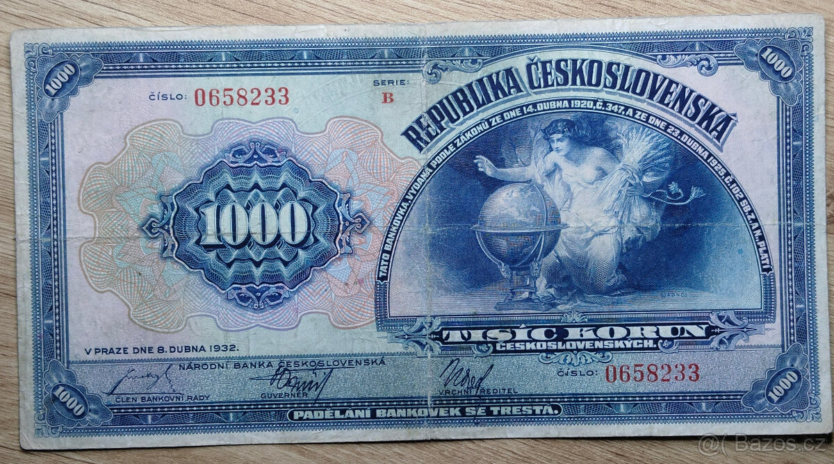 Prodám vzácnou Československou bankovku 1000 korunu 1932 série B. Bankovka stav 3 viz foto. Nebo cenu nabídněte..
