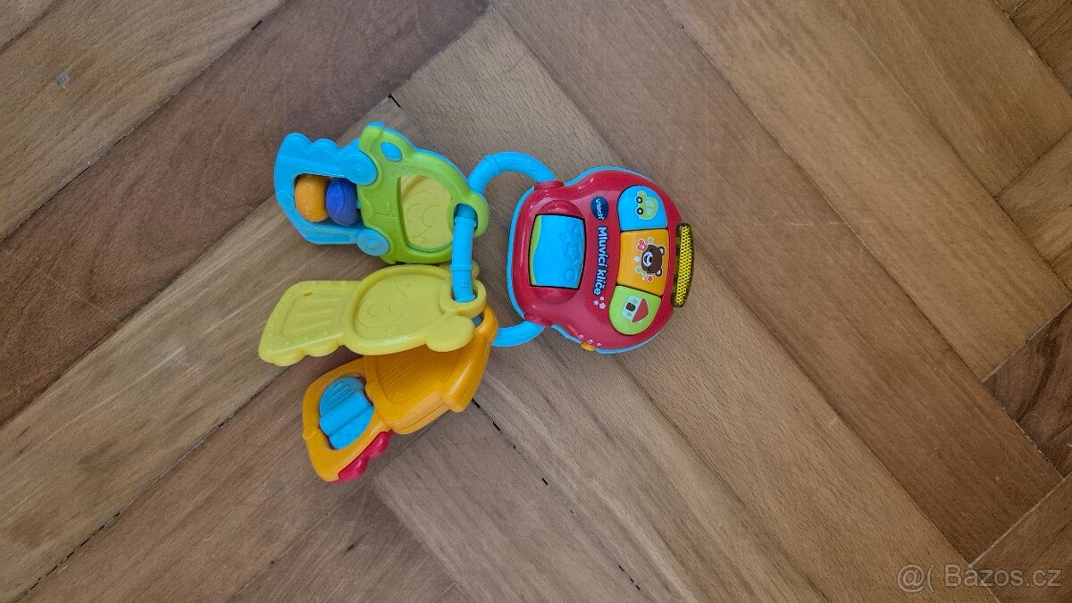 Funkce: Obsahují pohybové čidlo a barevná tlačítka, která spouští zábavné fráze, melodie a písničky. Rozvoj: Pohyblivé prvky a třesení s klíči rozvíjí jemnou motoriku a interakci dítěte. Využití: Klíče slouží také jako kousátko pro masírování dásní dítěte. Obsah: Klíče obsahují různé prvky pro smyslové hraní, jako jsou otáčející se disky, zrcátko pro sebeobjevování a posuvné a chrastící korálky. Dostupnost: Jsou k dispozici v českém jazyce. Jako nové,málo používané.