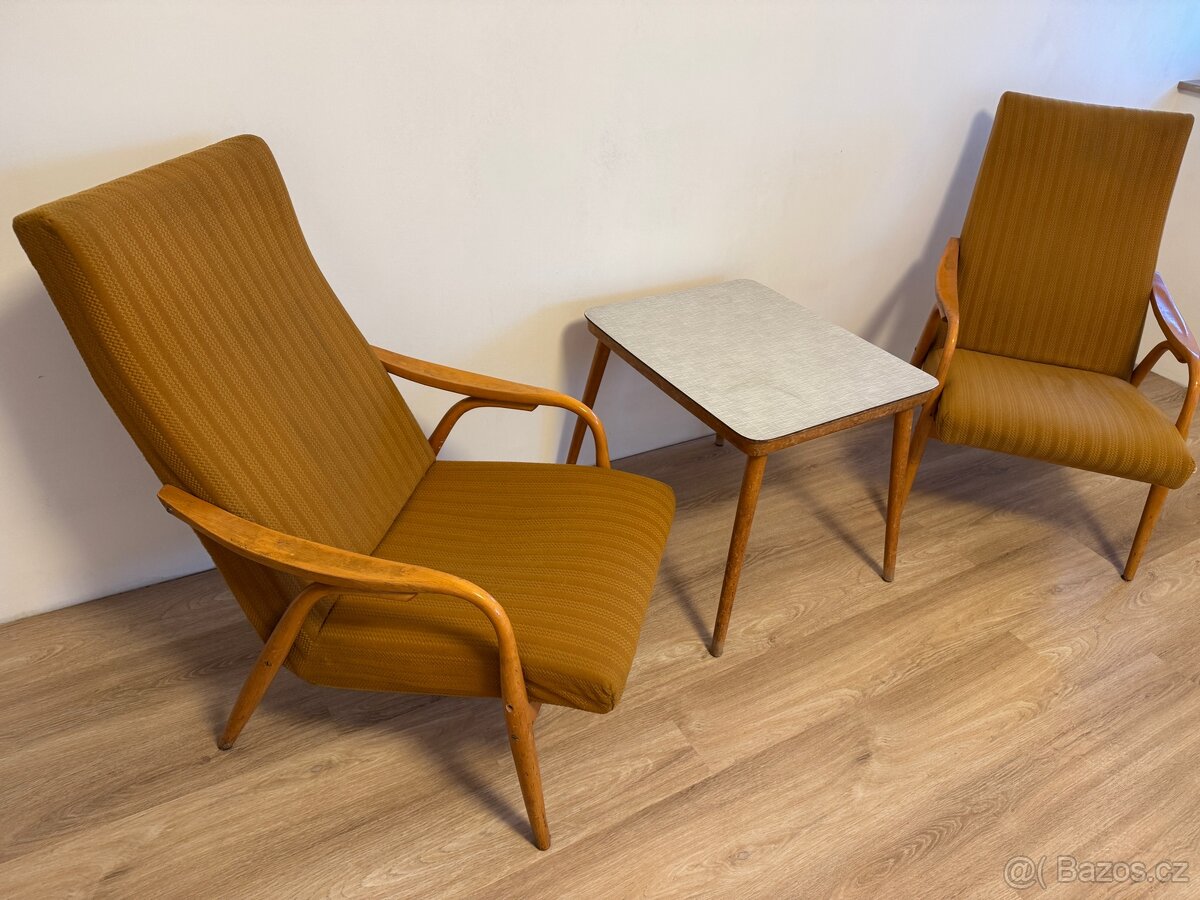 Prodám 2 křesla TON bez nutnosti renovace čalounění a stolek. Cena je pevná a prodávám pouze vše dohromady. (křeslo, Jiroutek, retro, expo, Brusel, Halabala, Koželka, Kropáček, Antonín Šuman, TON, Thonet)