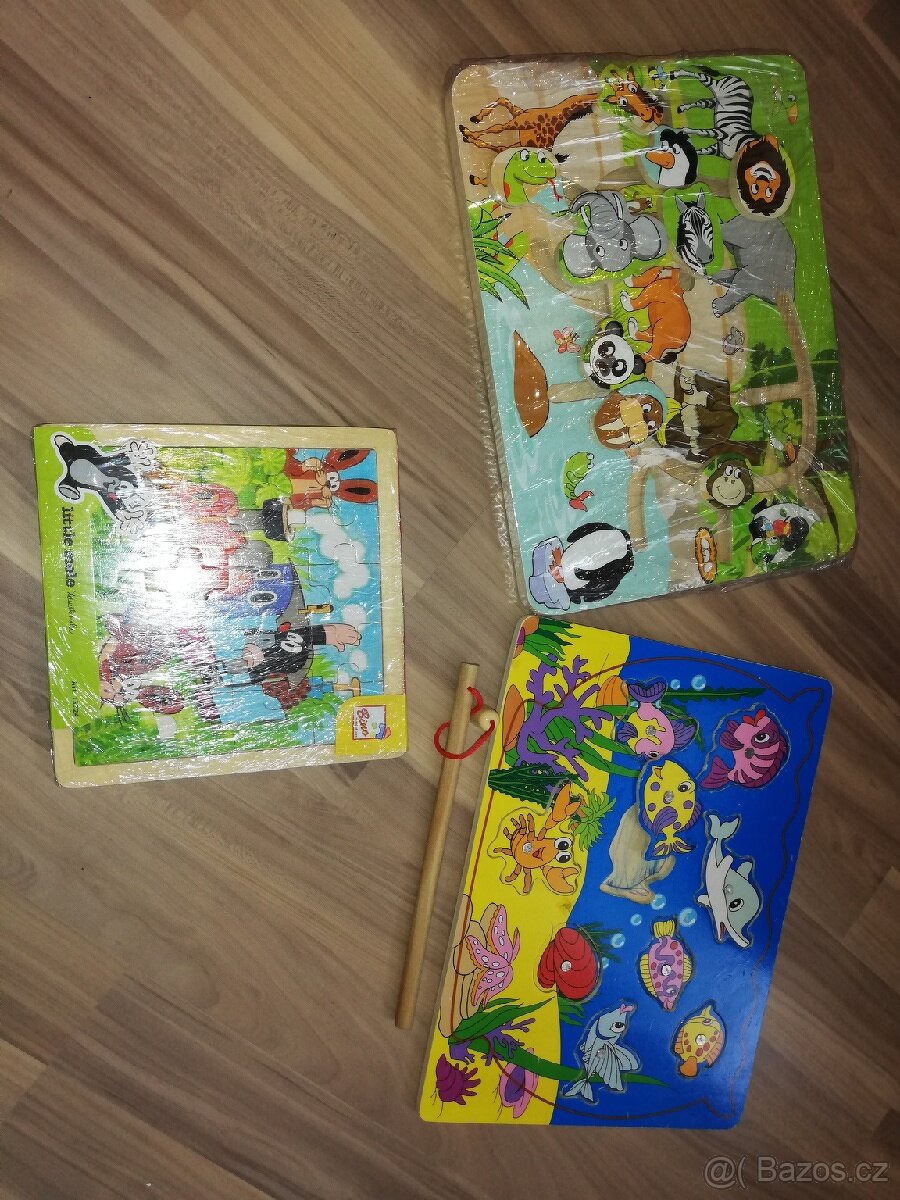 Hrané. Posouvání zvířecích hlaviček téměř nepoužité. Lovení rybiček hrané hodně. Pod rybičkami pokreslené. Puzzle Krteček má na jednom dílku lehce odtrzeny potisk. Včetně originál papírové podložky, podle které dítě staví. Prodej pouze jako celek. Určitě ještě poslouží. Z nekuřácké domácnosti. Cena za vše. Osobní předání v Litoměřicích nebo plus poštovné 79 Kč přes Zásilkovnu nebo 90 Kč poštou.