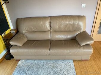 Kožená dvojsedačka ze silné kvalitní kůže, rozměry níže. Robustní konstrukce z masivního dřeva, zakázková výroba v ČR. Barva béžová s nádechem do šedivé. Není rozkládací. Vynikající stav, mám ji necelý rok, většinu času ji používal jen jeden dospělý. Jediná drobná vada u nohy vlevo dole, viz fotka. Nekuřácká domácnost bez dětí. Délka 202 cm, hloubka 90 cm, výška 93 cm. Sedák výška 40 cm, hloubka 54 cm, výška opěráku cca 66 cm. Dřevěné nohy výška 5 cm. Jen vlastní odvoz. Pozor, nevejde se do kombíku, jen do dodávky nebo na větší vozík. Při odvozu bude nutné odšroubovat nohy, jinak se nevejde do dveří. Původní cena 26 tisíc. Důvod prodeje - stěhování. V případě zájmu můžu nabídnout k odkupu ještě kožený taburet - podnožku ve stejné barvě, rozměr 60x60 cm, výška 40 cm, vynikající stav, cena 4 tisíce.
