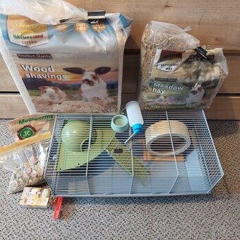 Prodám výbavu vhodnou pro malé druhy křečků (Džungarský). Klec s domečkem (https://www.superzoo.cz/klec-small-animals-erik-seda-se-zelenou-vybavou/), kolečko, miska, napáječka, velké balení podestýlky, balení slámy, krmiva (směs, pamlsky, červy). Je to kompletka, stačí koupit jenom křečka. Velmi zachovalé, čisté.