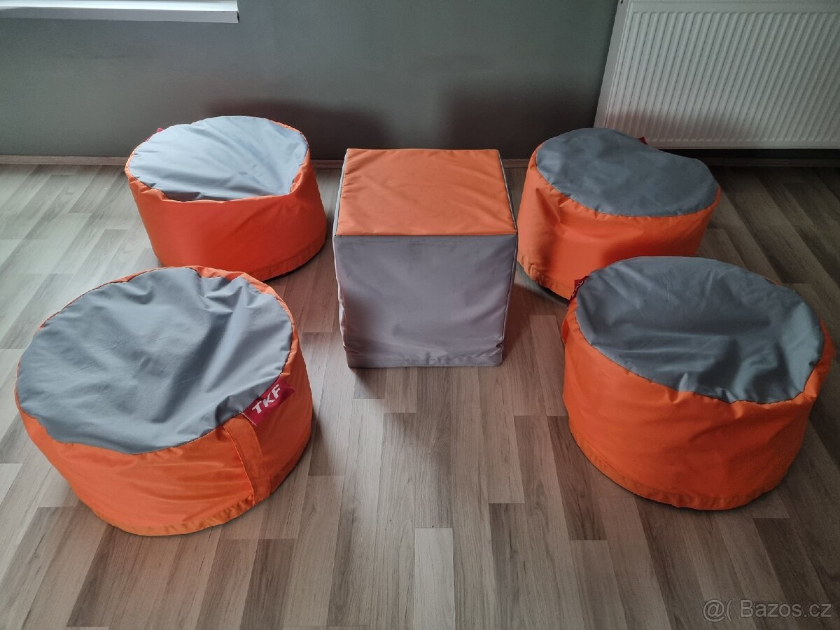 Cena: V textu. Prodám 4 ks sedacích vaků + stolek použité na jedné akci.Jsou jako nové.Obaly je možné zvlášť vyprat. Cena za komplet 2500,- Rozměry Výška-40 cm Šířka-68 cm