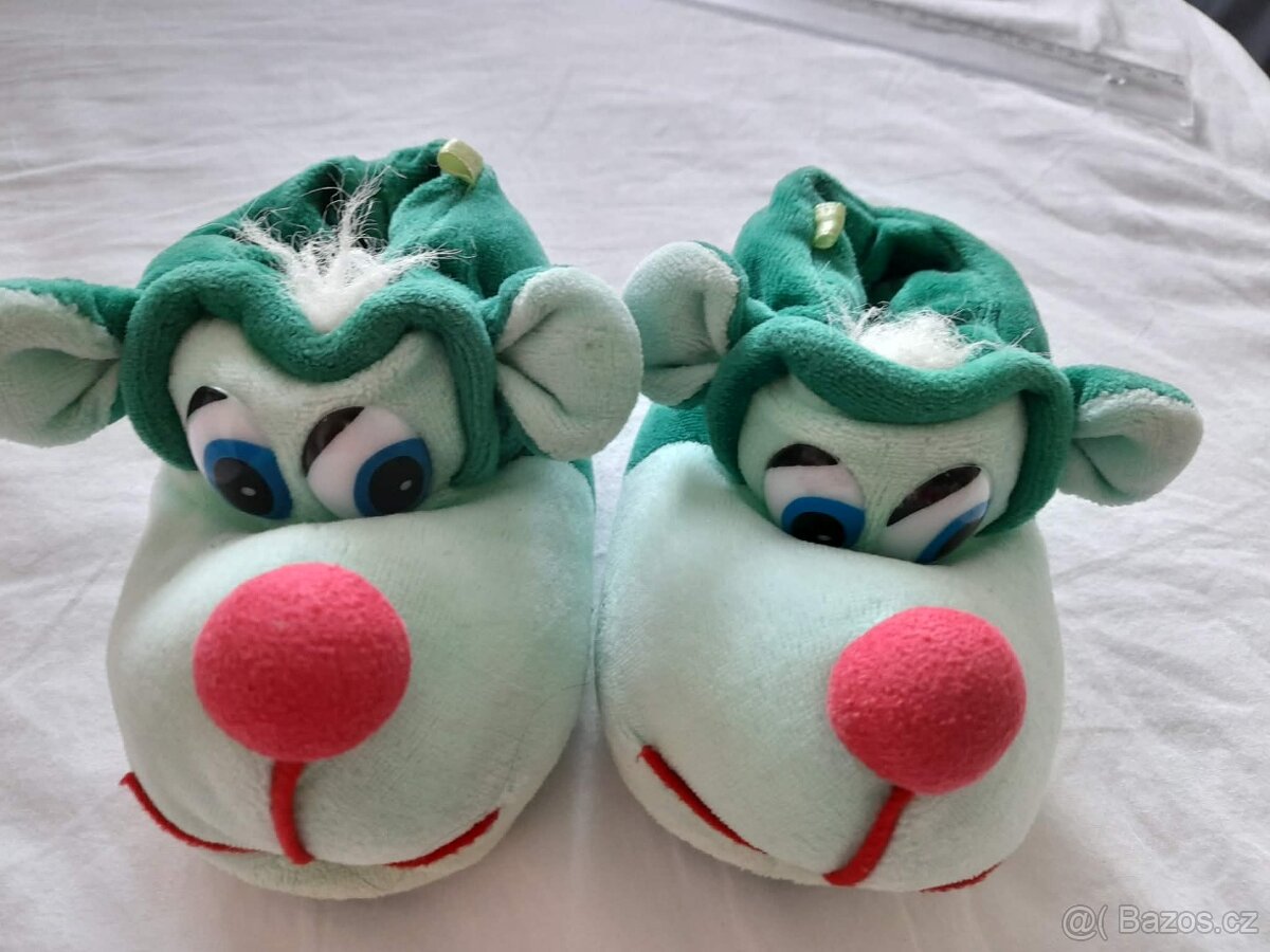 Dětské bačkory zelené 50 Kč, Závěsné hračky, kus 40 Kč. Látkový závěsný nad postýlku 30 Kč. Žába hajánek 30 Kč, žába závěsná 40 Kč, zajíček plyšový 20 Kč.