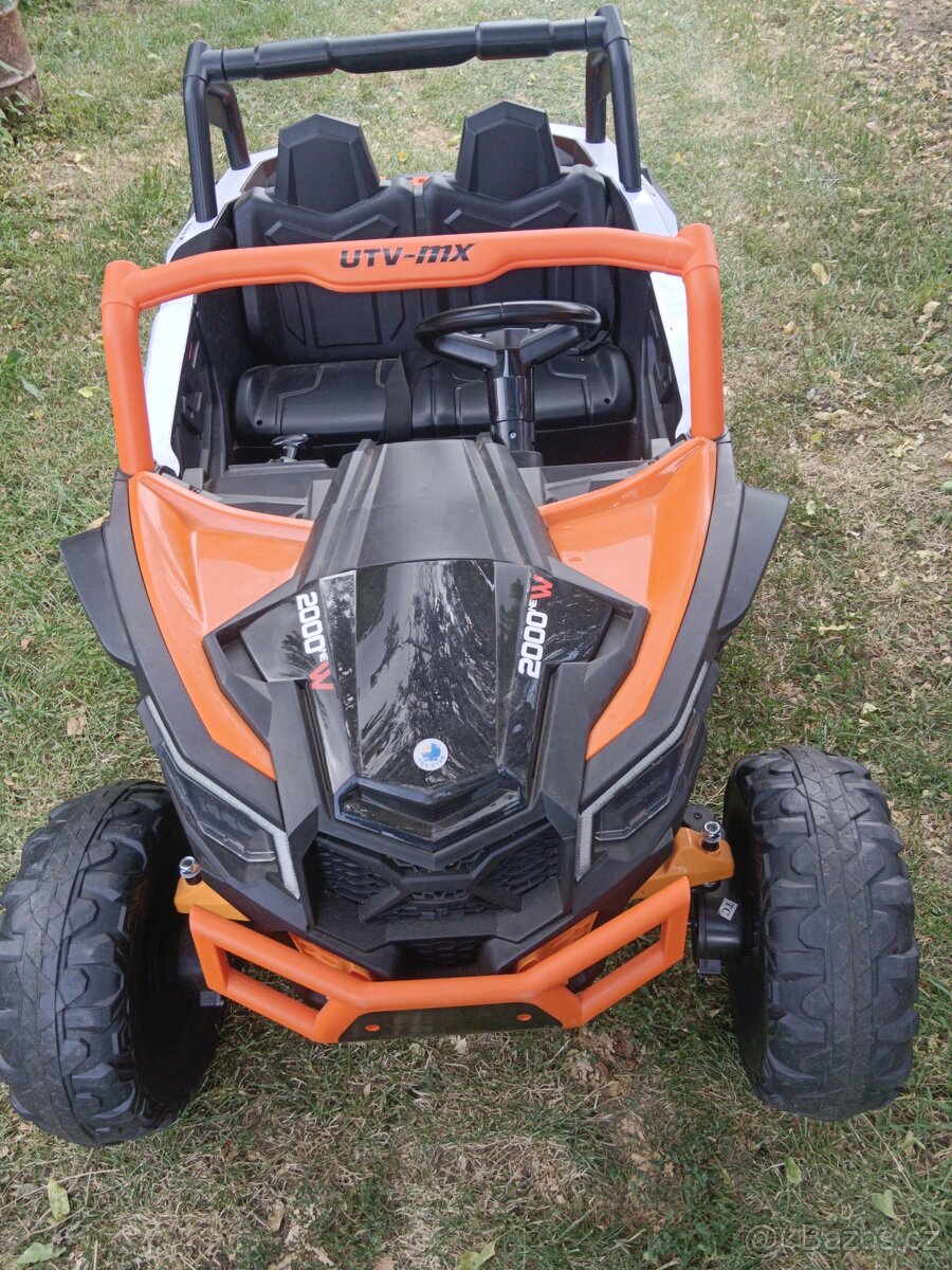 Prodam zanovni el.auticko 4x4 na 24V.Auto koupeno pred rokem.Najeto pet km.Baterie pravidelně nabíjena.Je k tomu dalkove ovladani a nabijecka.Myslel sem,ze auto udela synovi rados,ale neudelalo.Auticko je akorat zaprasene,stoji nenku pod plachtou.Je tam prehravac Mp3,zvuk startovani a predni,zadni led svetla.Dve rychlost v pred,jedna v zad,mali kufrik.Rozmer s.90cm,d.140cm.v.85cm.Nove stoji 15tis.,nas vyslo na 12 tis.