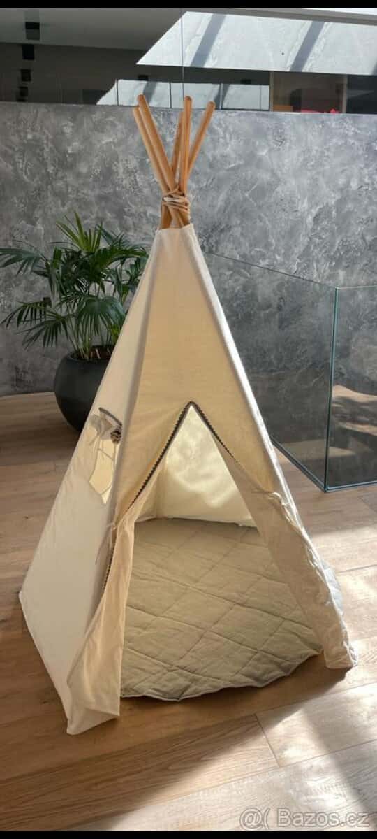 Prodám krásný dětský látkový stan s dřevěnou konstrukcí.