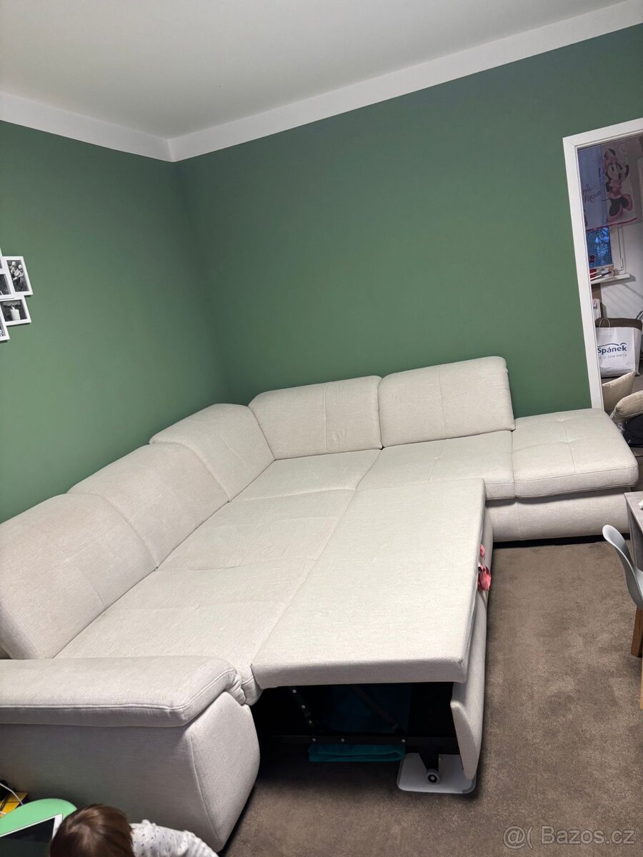 Prodám gauč s výsuvnými a polohovatelnými opěrkami, bočním úložným prostorem a rozkladem na spaní. 2 roky stará v krásném stavu, bez fleku a poškození. 315x260cm