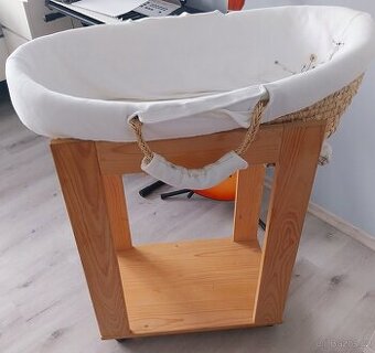 Mojzisuv kos s odnímatelnou vrchní části, že zůstane jen drevena konstrukce na kolečkách. Do ní lze dát nějakou menší vaničku. Kos má i tenkou matrací,pod kterou lze umístit menší monitor dechu. Stav použité, ale jak nové. Z nekurackeho prostředí. Ke koši je i dečka.